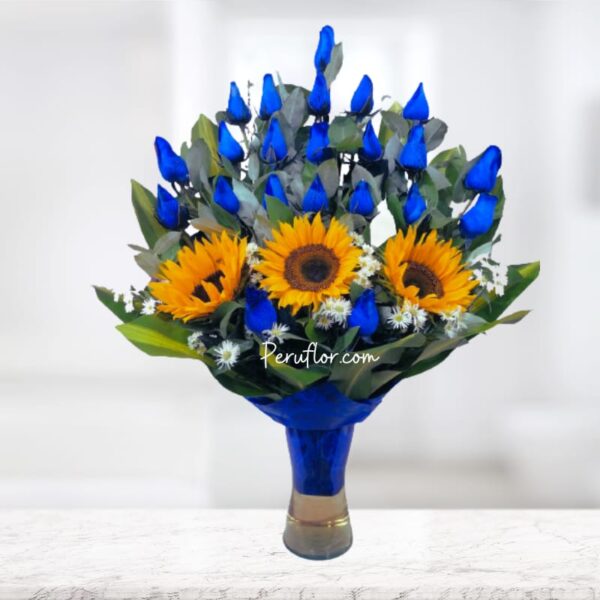 Florero de vidrio con 24 rosas azules, 3 hermosos girasoles,montecasino blanco, folljes y dedicatoria.